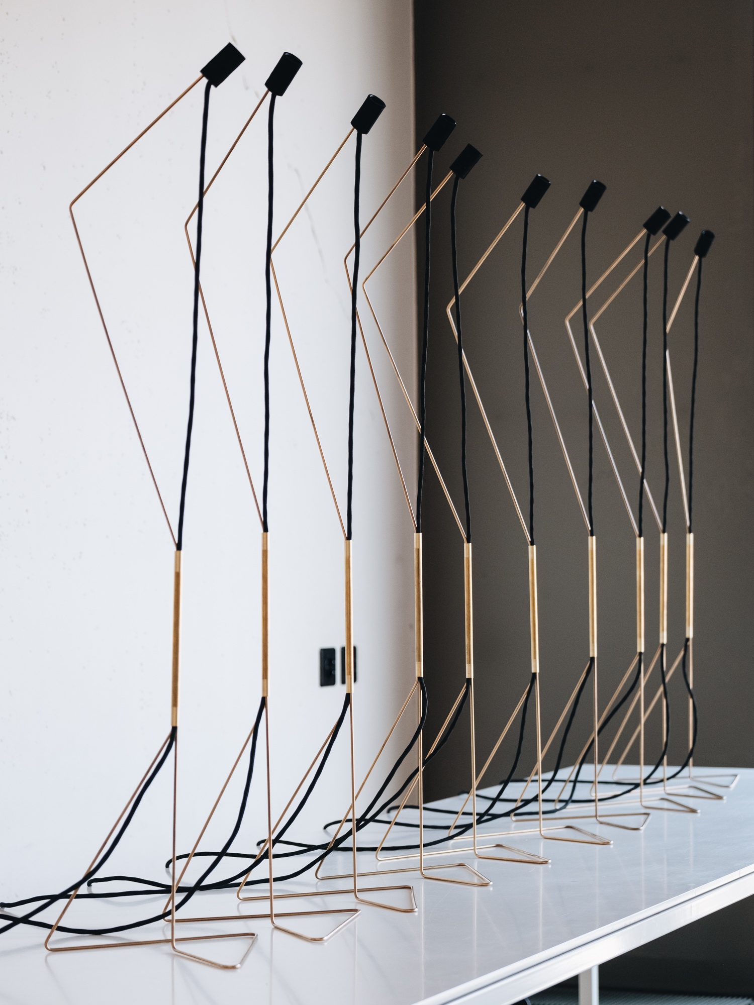 The Brass Lamp I is composed of three brass tubes, held together by pressure against a black fabric cable. The geometry of the tetrahedron-shaped base supports the loads while ensuring the stability of the system. The Brass Lamp I operates by reflection on a vertical surface. Placed in front of a wall, it diffuses its gentle light indirectly into the room.