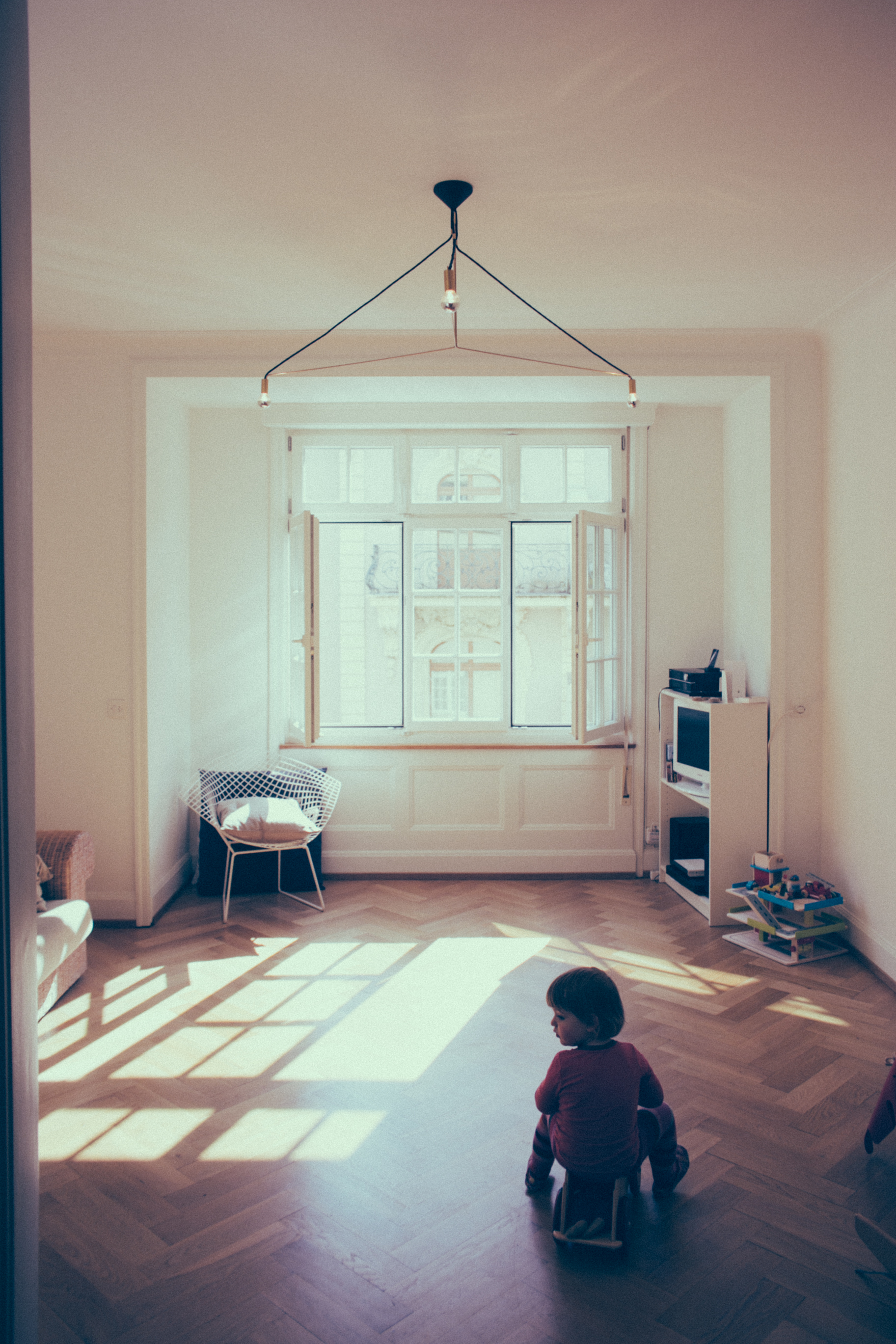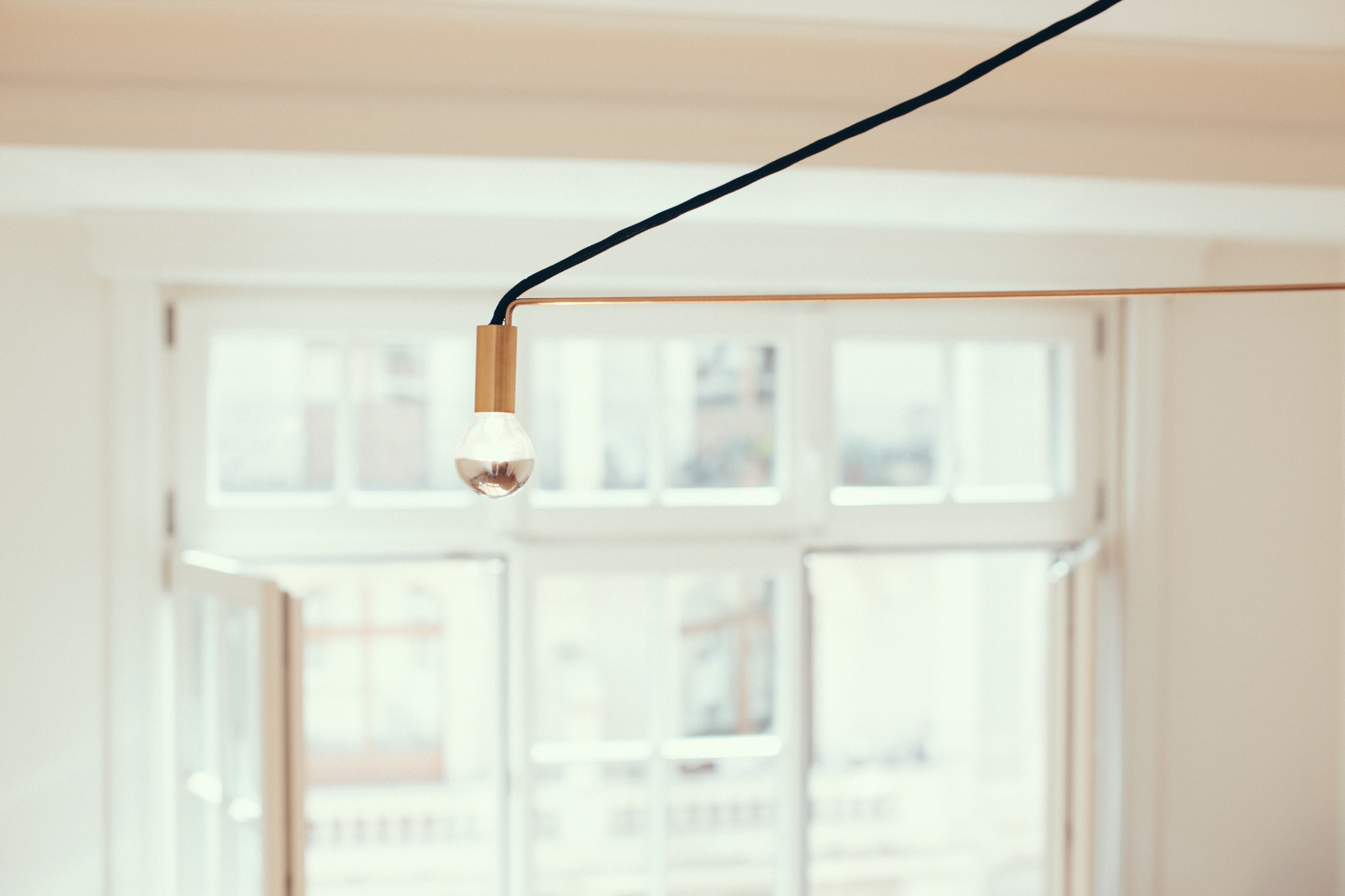 The Brass Lamp III is a suspension lamp working by reflection on a horizontal surface (celling). Three half mirrored light bulbs are suspended on a 4mm brass structure strengthened by black fabric cables. The symmetry of the lamp creates a game of shadows, drawing geometric shapes on the celling. The lamp can be disassembled and folded in a horizontal surface.