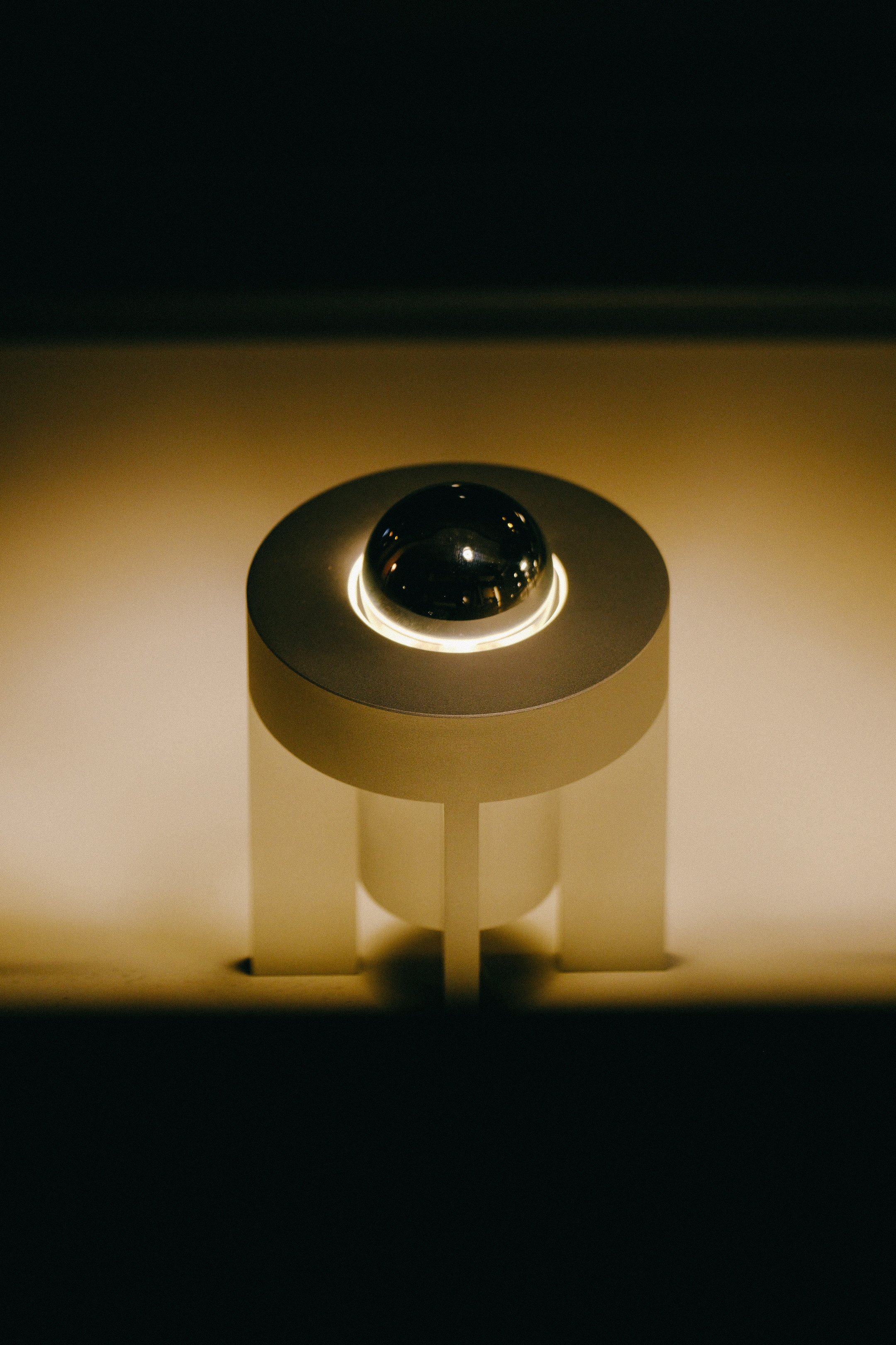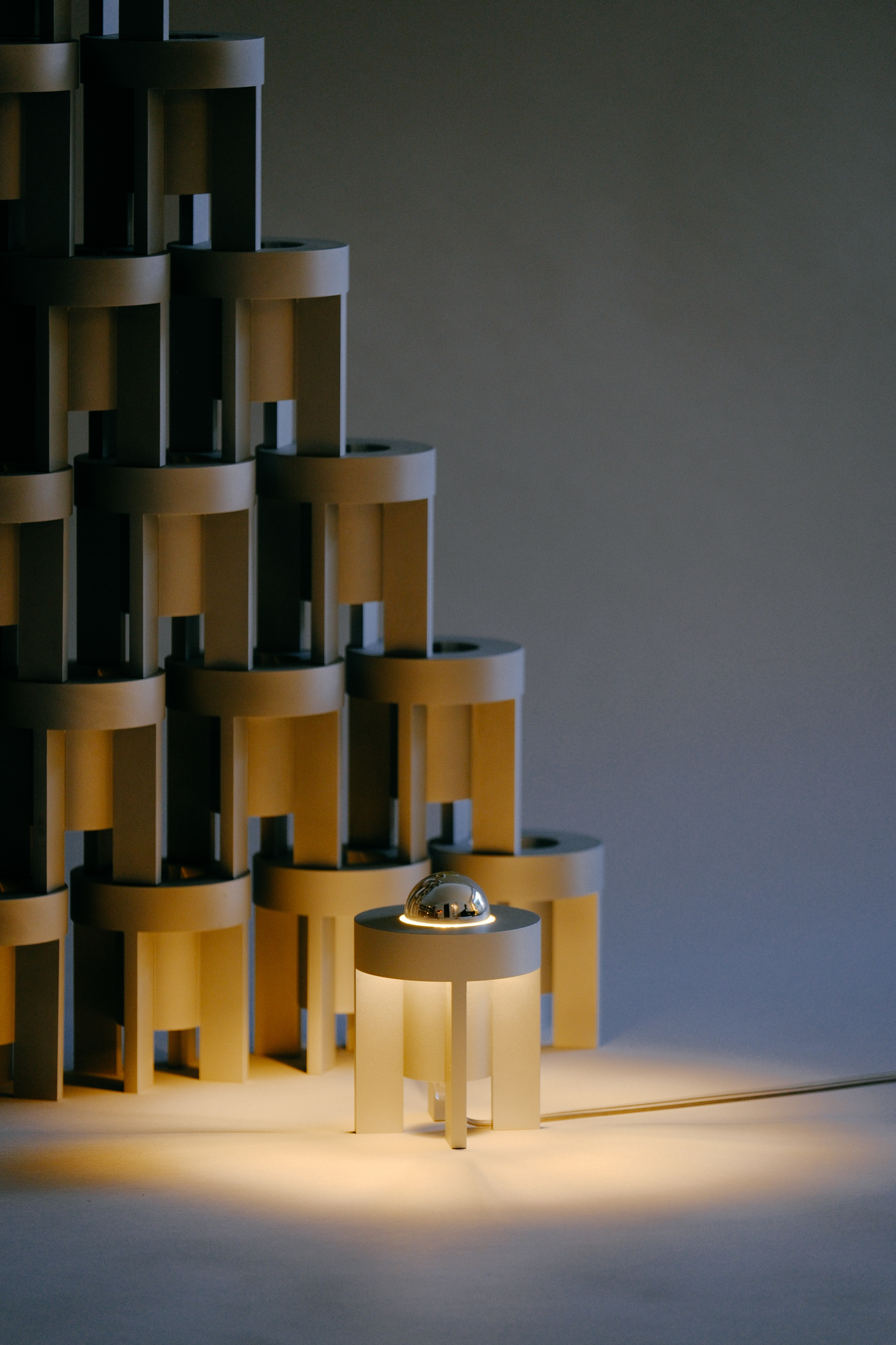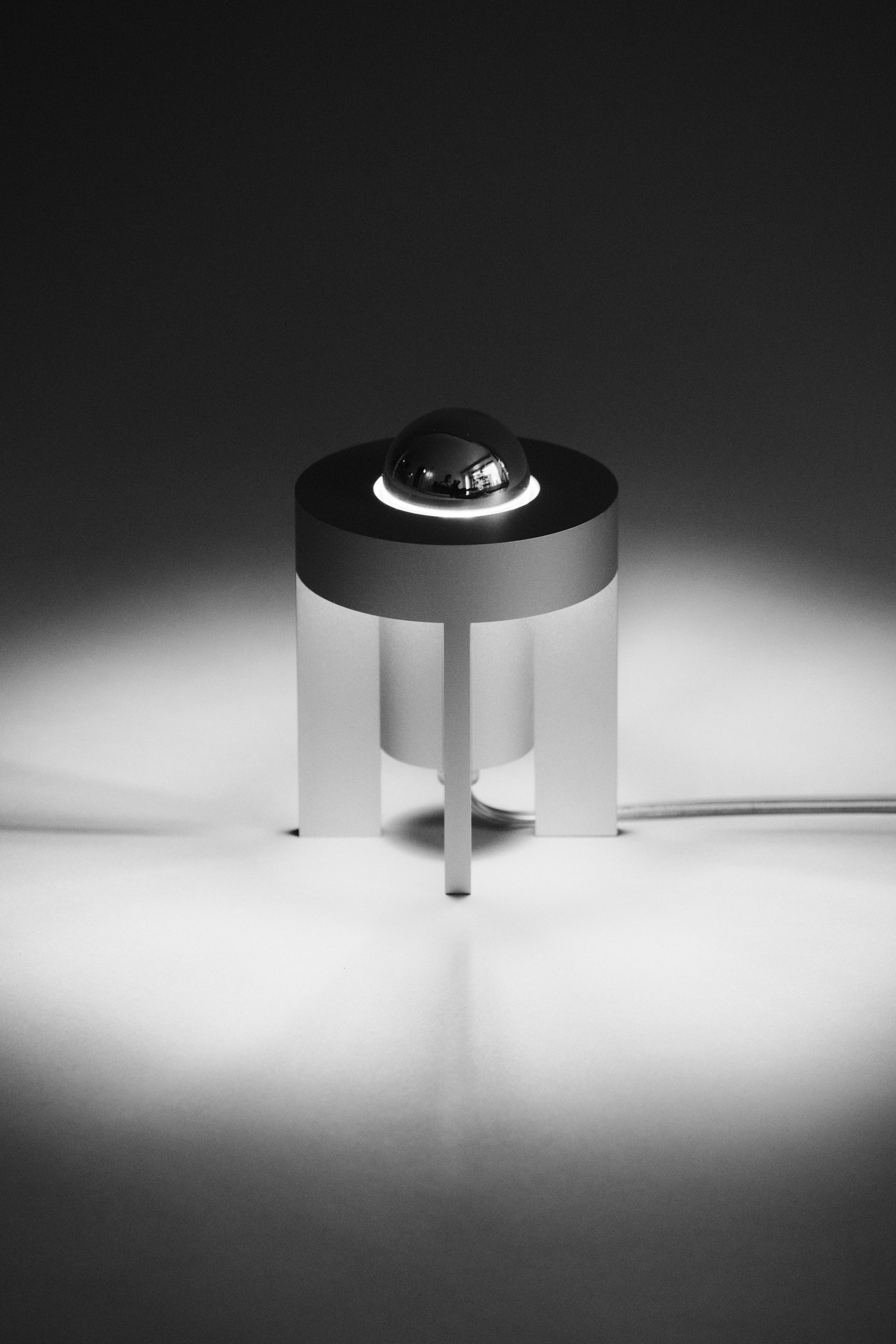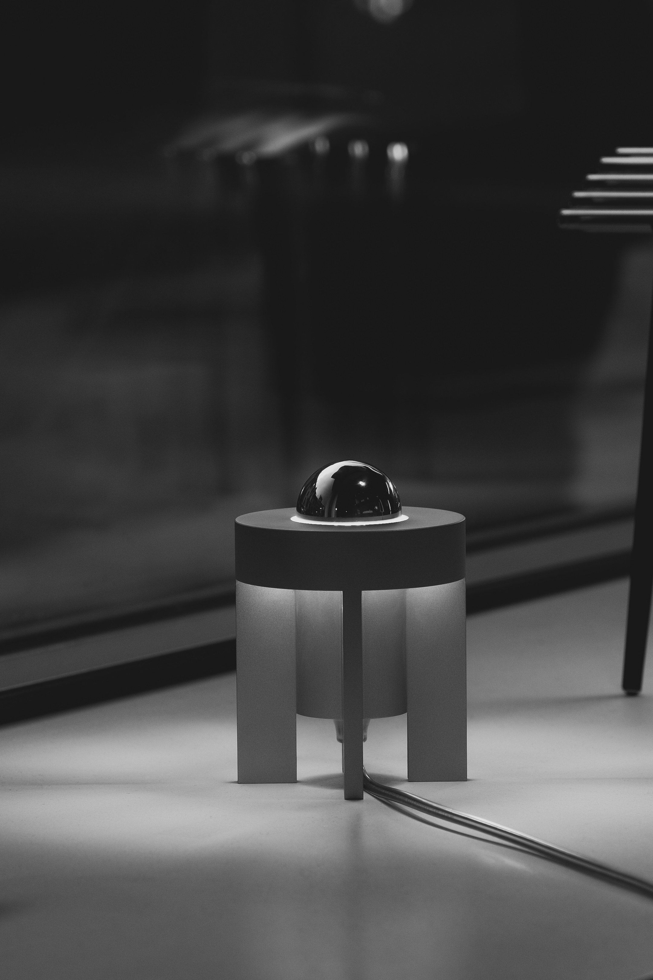 Cassini is a table lamp carved from a single block of aluminium. By directing the light downward through its core, the lamp creates a diffuse and indirect illumination.