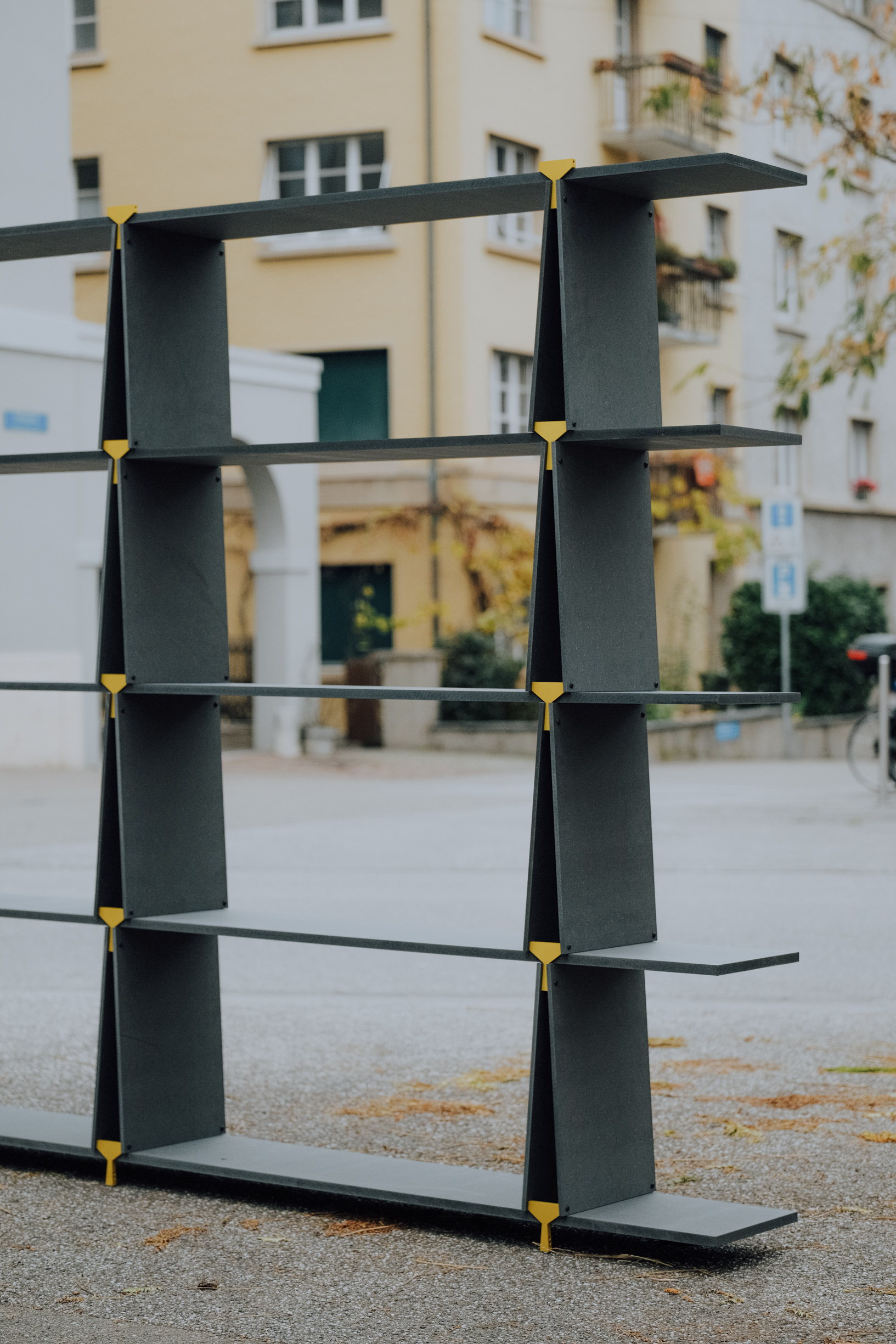 Philae is a modular bookshelf system made of cnc aluminium connectors and mdf panels. The structure works by triangulation–involving the use of triangular shapes to ensure stability and resistance to bending moments. The resulting inclination of the vertical panels enables books to safely stand with a 5° angle, avoiding the use of bookends.