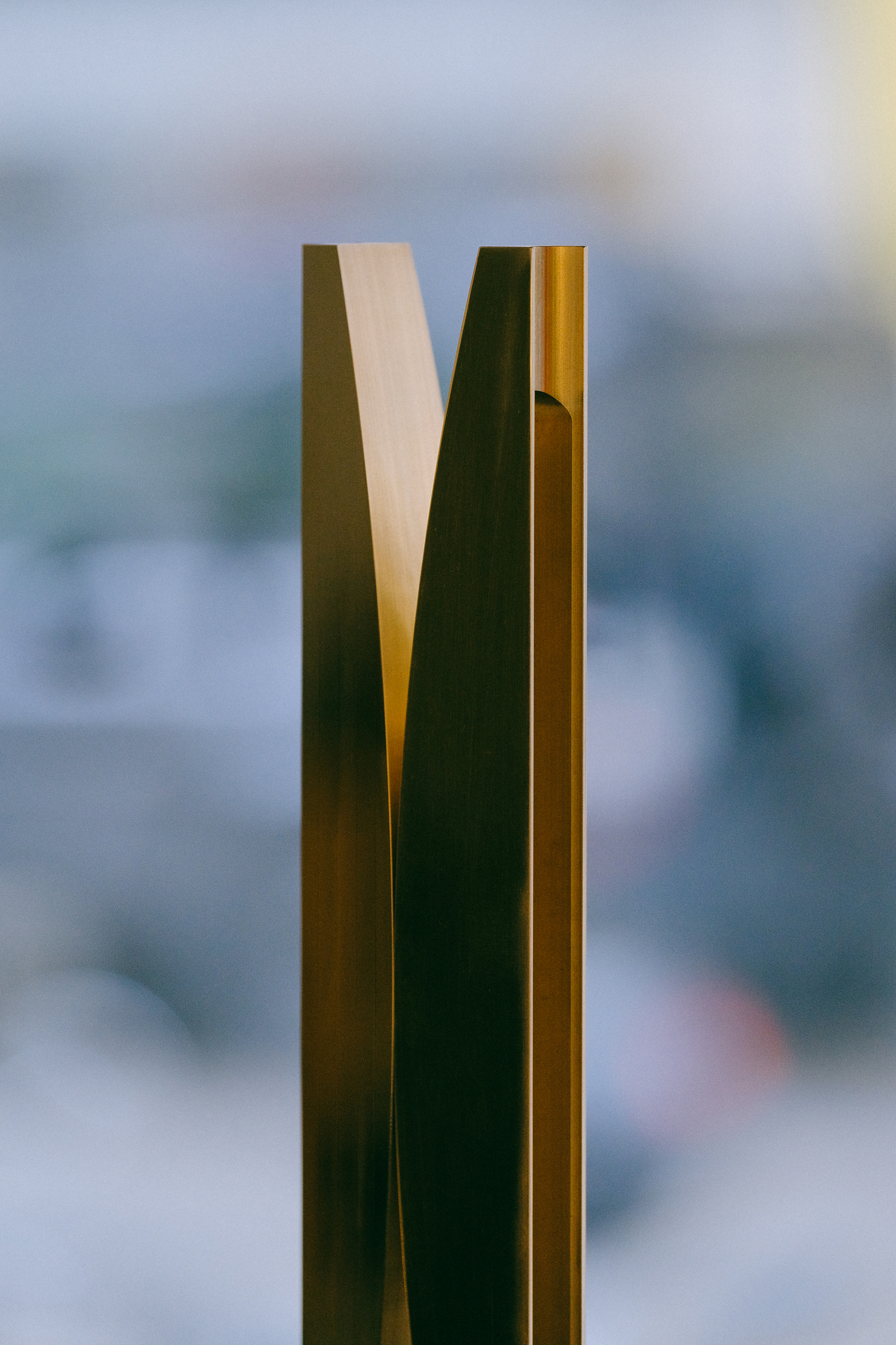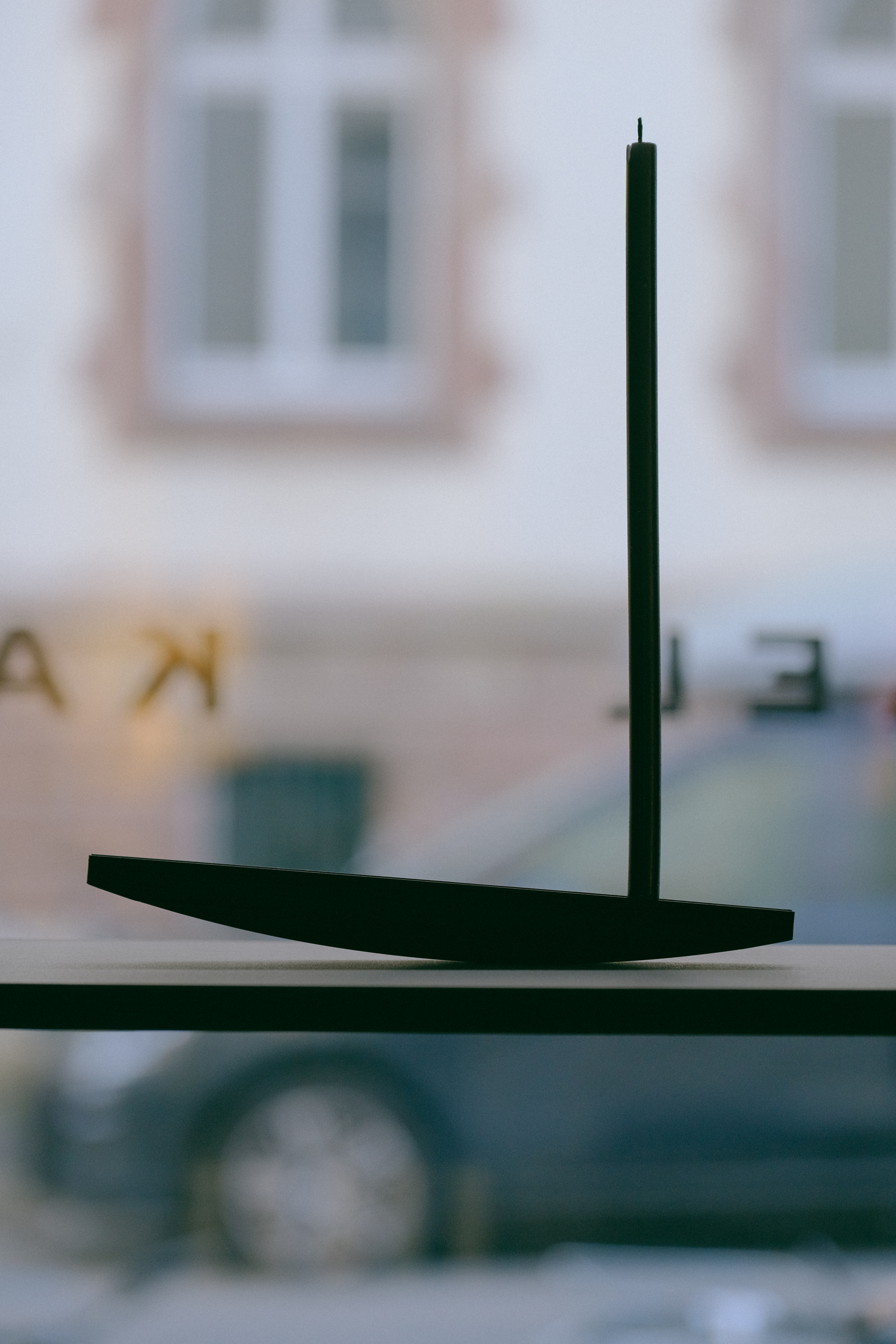 The precise carving of the piece provides an ideal balance of the weight of the object. When loaded with one candle, the object rotates and gradually return to its original position as the candle’s end is reached. If two candles are mounted, they balance each other, and the object remains horizontal, as would people standing on a boat. A long circular slit on the top of the holder allows the candle to rest horizontally when unused.